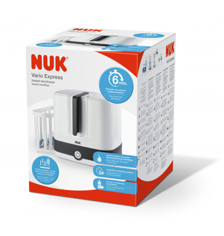 Caractéristiques du Stérilisateur électrique 6 minutes vario express : Dès la naissance Stérilise en 6 minutes Jusqu'à 6 biberons simultanément Très pratique et facile d'utilisation au quotidien Il contient 1 pince à biberon, 1 panier pour accessoires, 1 grille et 6 tiges Panier amovible pour les accessoires de petites tailles