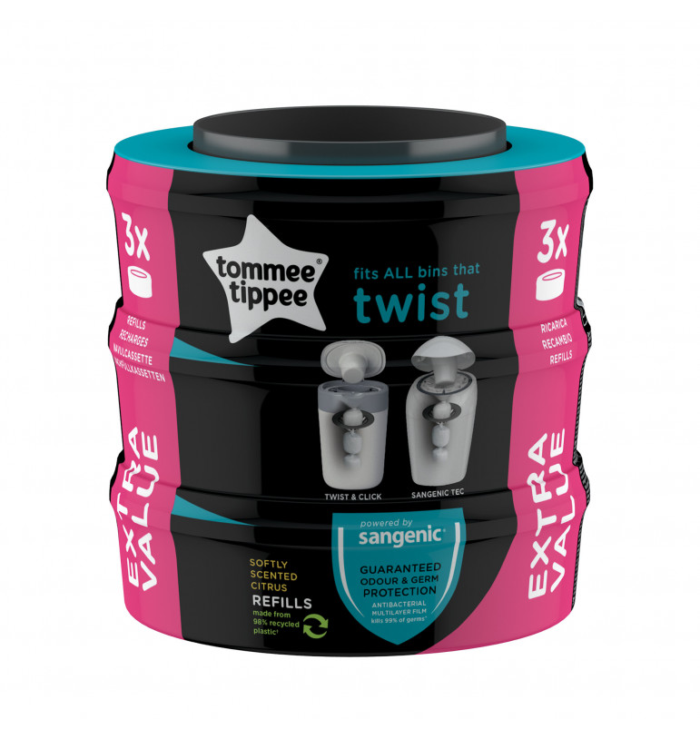 Twist & Click et Sangenic TEC : Les recharges Twist & Click sont compatibles avec toutes les poubelles à couches qui tournent de Tommee Tippee : Twist & Click et Sangenic TEC (non compatible avec la poubelle Simplee Sangenic)