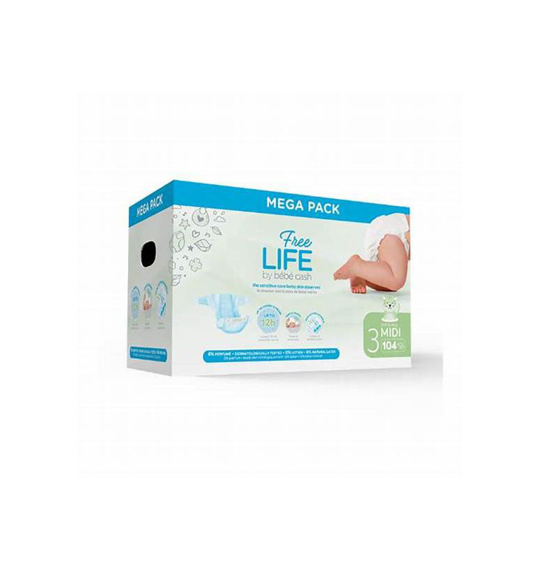 Douceur et absorption maximum Disponibles en différentes tailles (de la taille Prématuré à la taille XL), les couches Freelife by Bébé Cash protègent les bébés au cours de leurs premières années. La forme anatomique de la couche suit parfaitement les formes du corps de bébé, ce qui lui permet de bénéficier dune totale liberté de mouvement. Le voile supérieur doux des couches permet déviter les érythèmes et la poudre absorbante diffuse rapidement le liquide pour que bébé reste bien au sec. Les barrières anti-fuites situées à lintérieur de la couche apportent une protection supplémentaire. Les attaches de la couche peuvent être ouverts et fermés encore et encore. Il est ainsi facile de vérifier si bébé a besoin dêtre changé. Caractéristiques techniques des produits Freelife : - Gamme Hypoallergénique - Garantis sans TBT (tributylétain, composé organique de létain) - Sans paraben ou autres substances biocides, - Non chlorés, - Sans latex, lotion adoucissante, colorant ou parfum, - Origine de la ouate de cellulose garantis SFI, - Technologie EXTRA DRY qui permet une absorption rapide de la couche dacquisition, - Testés dermatologiquement. Double matelas absorbant La couche dacquisition fluff avec SAP fait pénétrer rapidement lurine à lintérieur du double tampon. Le change est sec en surface, la peau de bébé est préservée et reste douce. Technologie Supercore Le change plus fin et plus souple offre à bébé une liberté de mouvement tout en lui garantissant une absorption optimale. Voile respirant intégral Le voile et les ailes élastiques micro aérés permettent à la peau de bébé de respirer. Toucher textile Le revêtement «textile» intérieur et extérieur garantit à bébé douceur et confort. Design très coloré Revêtement textile et velcro frontal imprimés avec différents animaux selon la taille. Maintien parfait La forme adaptée et le système dattaches velcro « elastic ears » très résistant garantissent à bébé une liberté de mouvement. La couche reste en place même quand bébé se déplace. Protection maximale Les barrières anti-fuite et les élastiques latéraux offrent une double protection contre les fuites. La couche bouge avec bébé et lui assure confort et sécurité.