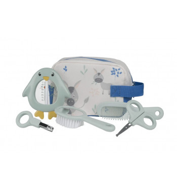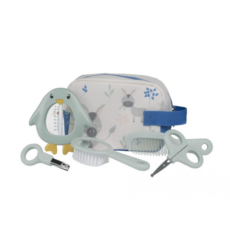 e trousse de toilette Bébé Confort est un set complet et compact, idéal à la maison ou en voyage La trousse comprend : 1 thermomètre de bain ludique en forme de pingouin, 1 paire de ciseaux ronds, 1 coupe-ongles ergonomique, 1 brosse aux poils doux et miroir intégré et 1 peigne aux dents arrondies - trousse lavable en machine - Dès la naissance
